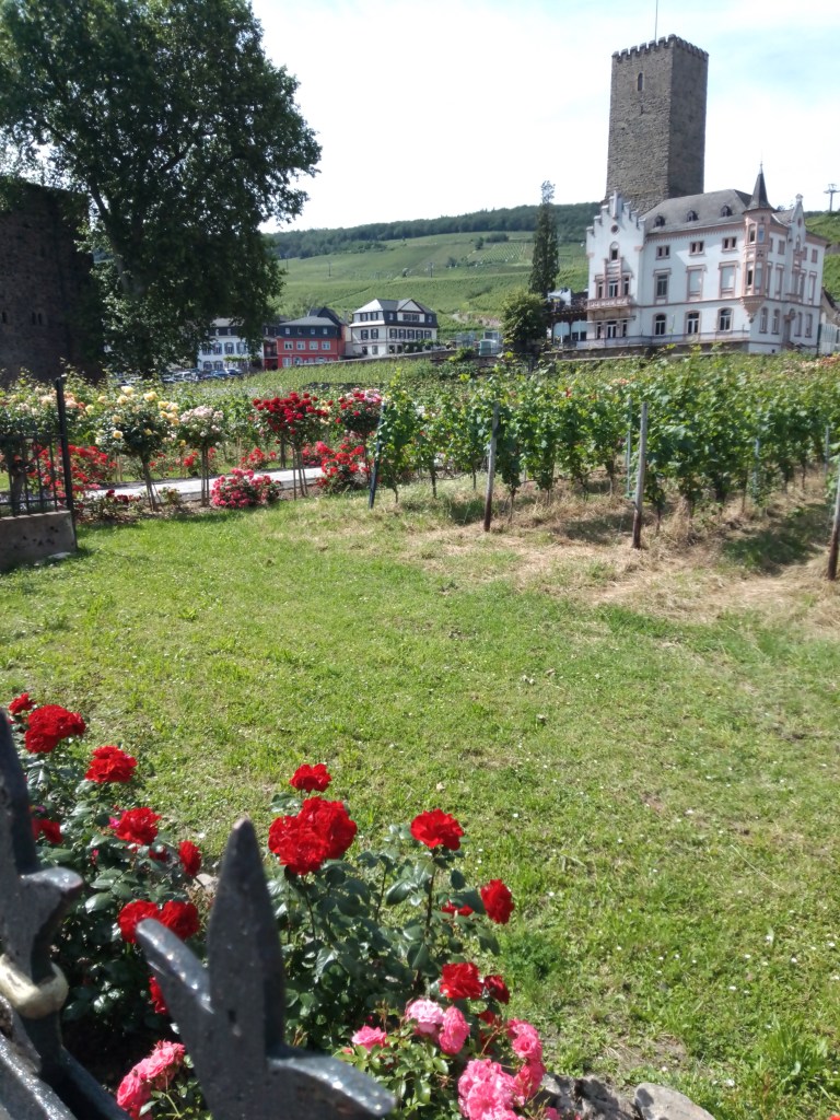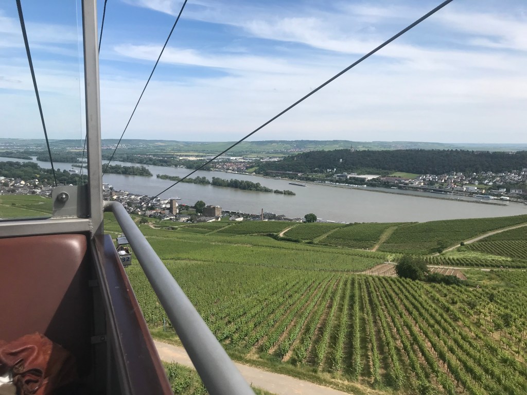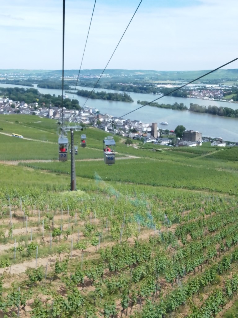Wir fuhren durch das mit vielen Burgen versehene und wirklich sehr reizvolle Rheintal bis Rüdesheim, und ahnten bereits, dass es an der Seilbahn dort voll werden könnte. Auch ohne kickende Kinder war der Zug gut gefüllt, und weitere Reisende stiegen fast an jedem Bahnhof zu. So erfreute auch eine irgendwie vatertagsanmutende Gruppe von Jungmännern mit wummernder Musik und nicht immer tonsicherem Mitsingen freund-lich die anderen Reisenden. Sie stiegen ebenfalls in Rüdesheim aus und strebten bier-flaschenschwenkend in Richtung Rüdesheimer Seilbahn. In Rüdesheim angekommen folgten wir den dem Zug entsteigenden Massen, und fanden, diese kaum verfehlend könnend, dort eine des Gondelbesteigens harrenden Schlange. Bei entsprechender Stimmung versprach dies sicher einen interessanten Austausch mit anderen in der Sonne Wartenden, allerdings war uns nicht wirklich danach, und so beschlossen wir erneut kurzentschlossen eine Planänderung. Also: nicht wie die Meisten in Rüdesheim aufzufahren, auf der Höhe nach Assmannshausen zu wandern und dort mit dem Sessellift wieder abzufahren, sondern es gegenstromschwimmend zu versuchen.