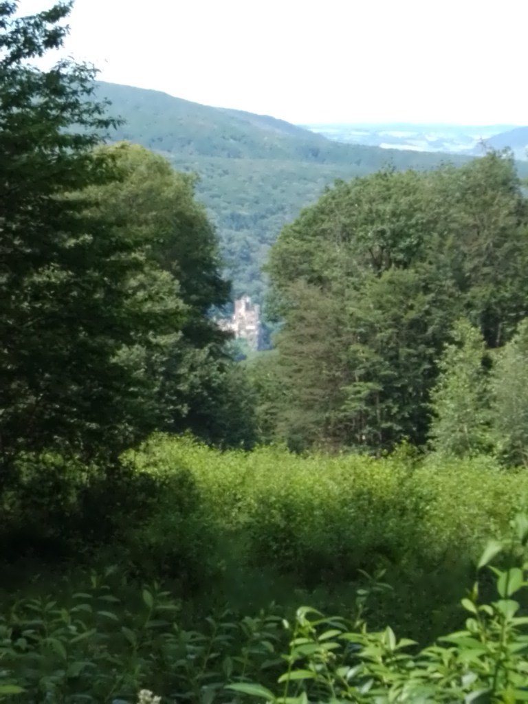 Der Hauptstrom der Wandernden kam uns entgegen, da sie den „üblichen“ Weg in Rüdesheim auf- und in Assmannshausen abfahrend nahmen. Einige wanderten mit Bollerwagen mit oder ohne Kinder. Andere mit weißweingefüllten Gläsern, was uns doch als etwas unpraktisch erschien. Auch gab es jüngere Zeitgenossen, die bade-mantelbekleidet (gerade nach durchzechter Nacht dem Bett entsprungen?) fort-schreiten, und andere mit gruppenbedruckten T-Shirts (Junggesellenabschied?). Einige übertönen das sicherlich störend-betörende Vogelgezwitscher mit gut hörbaren, mit-geführten Wummerklängen. Die Eindrücke, nicht nur der Natur, waren also vielfältig, und für uns zum Teil ein wenig befremdlich. Aber wir leben in einem freien Land und somit jedem/r das Seine/Ihre. Sicher könnte dies eher als Ausdruck der „deutschen ‚Leitkultur“ gesehen werden, als unser links- und rechts die visuellen Eindrücke, die Klänge und Düfte wahrnehmendes und behindertes „Walddurchschleichen“?