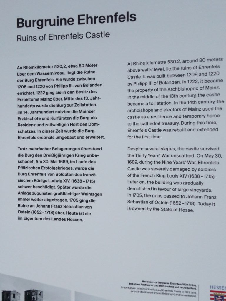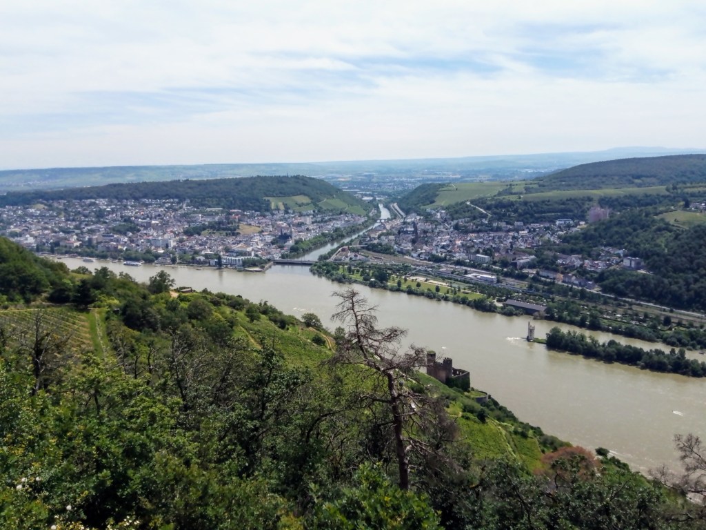 Unser Weg führte uns u.a. über einen Aussichtspunkt der „Burgruine Ehrenfels“, von dem man die Nahemündung sehen kann,