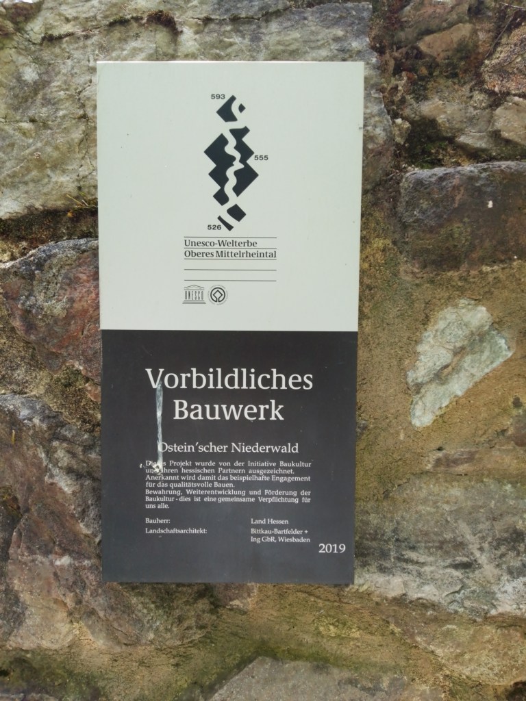 Nach vielleicht 15 Minuten Fahrt oben angekommen, erwartete uns ein Schild gut gekennzeichneten Wegen nach Rüdesheim durch ein angenehm schattiges Waldgebiet, den „Oststeinschen Niederwald“.