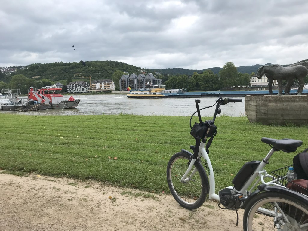 Unterwegs haben wir bei einer Rast am Moselufer einen netten Schnack und Austausch mit einem österreichischem Radlerpärchen, die wir des Dialekts halber für Schweizer halten, doch dann aufgeklärt werden, dass sie aus dem schweiznahen Österreich kämen. Mit dem Auto waren sie bis Koblenz und dann mit der Bahn – jeweils die Räder mitnehmend nach Trier gefahren, von wo sie nun moselabwärts zu-rückradelten. Wir hatten uns bereits in der „schönen Aussicht“ gesehen.