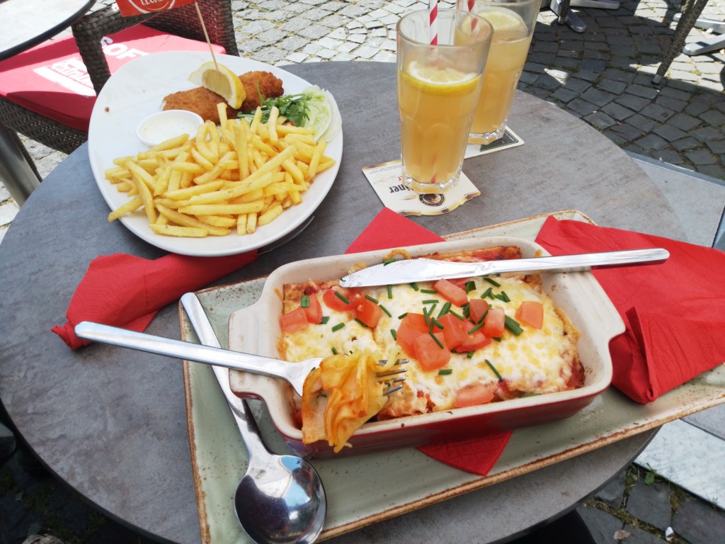 In Koblenz nehmen wir auf einem Platz einen Snack und einen leckeren Drink in Form von Apfelschorle mit einem Spritzer Zitrone ein.