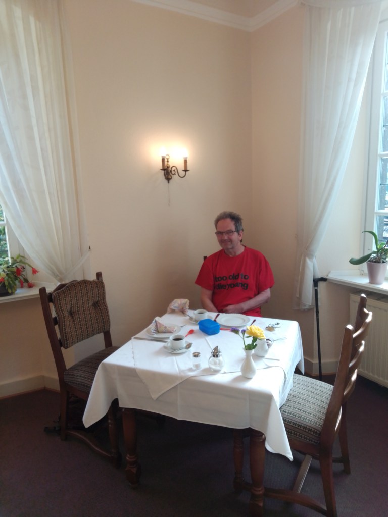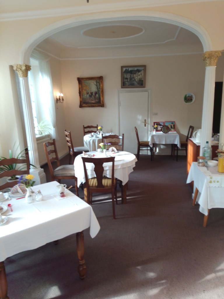 Es wird in einen wirklich mit viel Liebe eingedeckten Raum im ersten Obergeschoss serviert, und „serviert“ ist wörtlich zu nehmen. Beim Eintritt fragt der Pensionswirt, ob man Kaffee haben wolle – es gäbe auch Tee. Er serviert einen Teller, der kunstvoll mit Gurken-, Tomaten- und Radieschenstücken belegt ist sowie einen anderen mit etwas Obst. Auch ein Brötchenkorb, Butter, Marmelade, Honig und Wurst und Käse werden kredenzt.