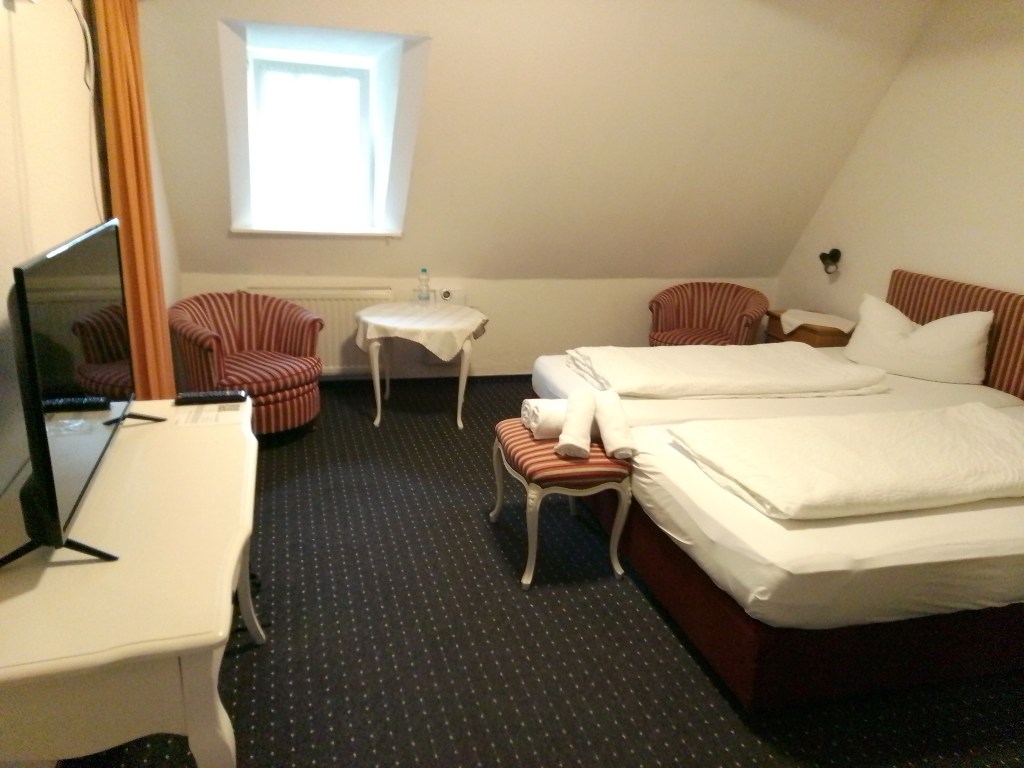 Die Treppe ist eine Herausforderung für Gehbehinderte und war dies sicher auch für die blinde Besucherin, von der der Wirt uns erzählte. Aber sie schaffte es, und wir auch. Ein Zimmer gibt es wohl auch im Erdgeschoss, wobei dann die Treppe zum Frühstück im 1. Obergeschoss bewältigt werden muss.