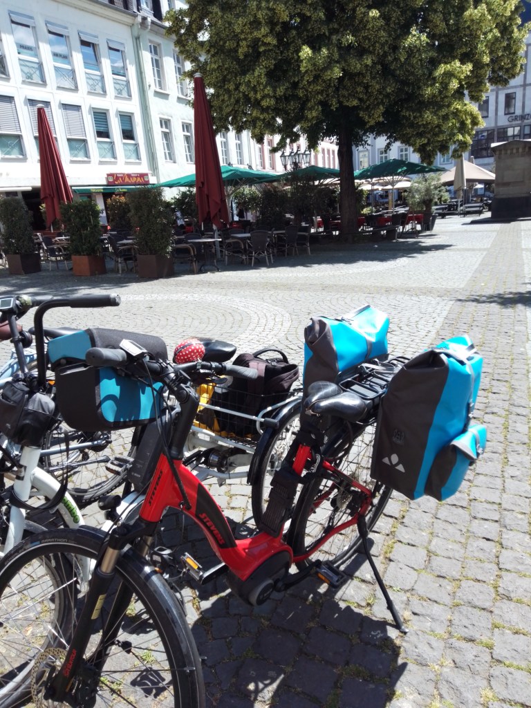 In Andernach fahren wir immer geradeaus durch ein Stadttor der Stadtmitte zu, wo sich nahe des alten Rathauses unsere nächste Unterkunft, eine kleine Ferienwohnung befindet. Die Räder können wir in den Innenhof schieben, die Ferienwohnung ist zweckmäßig mit guter und barrierefreier Dusche, etwas Geschirr, und natürlich einem Fernseher, WLAN und einem Doppelbett.