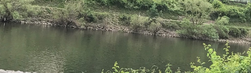 Jedenfalls haben wir den Eindruck, dass wir zu weit gefahren sind, checken dies im Internet und sind uns dann sicher. Also müssen wir ein Stück zurückradeln, und tatsächlich geht bald ein Durchgang näher zur Mosel hin und dann ein schmaler Pfad am Moselufer in Richtung Lehmen zurück. Wir fahren dort entlang, doch ist der befestigte Pfad wirklich recht schmal, und links von ihm droht ein Absturz über eine Kante, im besten Fall in Büche, oder gleich auf Steine am Moselufer.