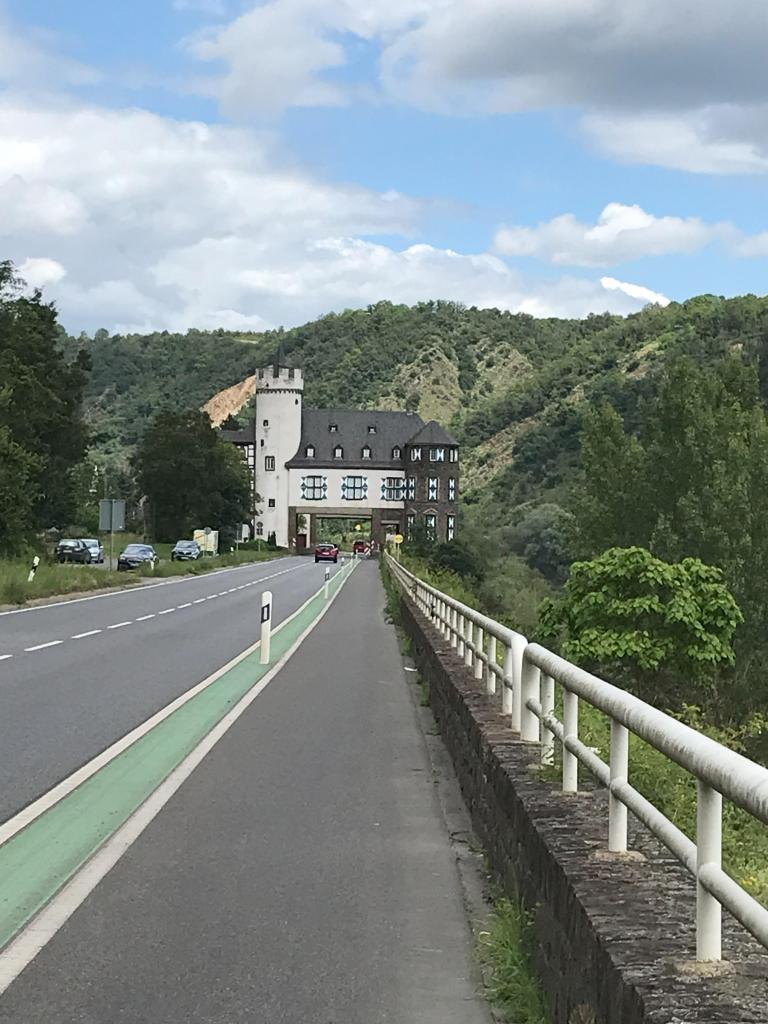 Aber für Besuchende, die aus Richtung Cochem kommen und zur Pension Marienhof streben, jedoch nicht nach blutdruckerhöhendem Abenteuer, zumindest Reisenden mit breiteren Gefährten als Zweirädern sei empfohlen, bereits in Lehmen auf die andere Seite der Bahngleise zu wechseln, oder bis Kobern weiterzufahren und dort durch die Durchfahrt zur Hauptstraße und dann jenseits der Gleise sofort links zurück in Richtung Liebig-Schloss und Pension zu fahren.