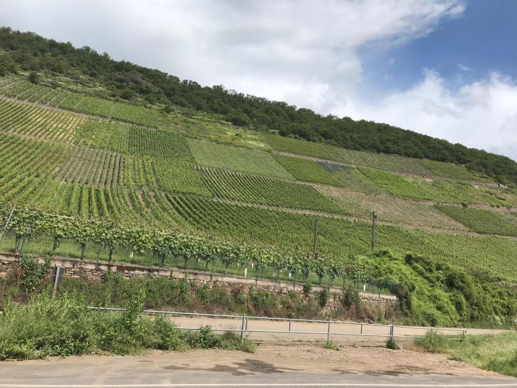 Gut: wir treffen andere Radler, die wollen heute noch bis Koblenz oder gar Mainz. Wie meine werte Begleiterin ein wenig kopfschüttelnd bemerkt, sind einige der Herren mehr oder weniger modisch und sicher praktisch funktionsgekleidet, während wir batikbehemdet doch eher nicht fahrradmessentauglich gekleidet sind. Zugegeben, uns fehlt für solche weitradelnden Pläne neben der passenden Funktionsklei-dung wohl auch der nicht-behinderte Ehrgeiz. Uns reicht als Tages-pensum die etwa 35 km bis Kobern-Gondorf und so wurden wir folge-richtig von den Funktionsbekleideten überholt und abgehängt. Dies stört uns nicht weiter, weil unserer Meinung nach in der Ruhe die Kraft liegt und in der gemütlich durchradelten Landschaft die Freude. An der Mosel besteht diese Landschaft neben Fluss und Dörfern aus Weinbergen, die teilweise hier an den weltweit steilsten Hanglagen liegen. Einige Flächen, besonders jene weiter oben, scheinen für den Weinbau aufgegeben zu sein, doch sieht man auch immer wieder Parzellen mit offensichtlich jüngeren Rebstöcken.