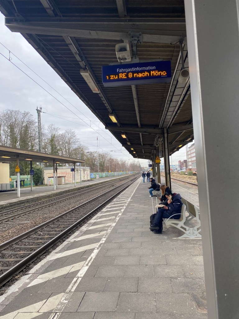 An allen Bahnhöfen außer Köln-Deutz gibt es Aufzüge, was mein Umsteigen mit Rollkoffer erleichtert. In Köln-Deutz hilft mir ein freundlicher Zeitgenosse, den Rollkoffer die lange Treppe hinunterzutragen – auf das Auffahrtsgleis (wie allen anderen Gleise) gibt es aufwärts Rolltreppen, so das es auch für mich einfach ist, das Bahngleis zu erreichen. Nur abwärts müssen lange Treppen bewältigt werden – und Vorsicht, die „Handläufe“ sind an einigen Stellen voll Taubenkot, mit dem ich vor einigen Wochen bereits unerfreuliche Bekanntschaft gemacht hatte.