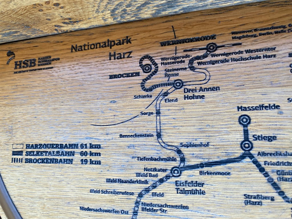 Wernigerode ist in der Mitte oben zu finden, die Brockenstation rechts unter dem Wort „Harz“