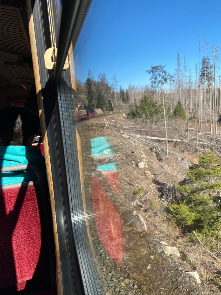 Einstieg und Sitzplatzsuche bewältige ich dann gut. Mir gegenüber setzt sich ein jüngerer Mann, der mit seinen Freunden hochgewandert war, unterwegs aber die Aussicht genießend sich den Fuß verknackst habe. Der sei nun total dick, so dass er lieber die Bahn bis Schierke nehme, wo dann seine Kumpel mit dem Auto auf ihn warteten. Tja, einen Moment nicht aufgepasst :-(