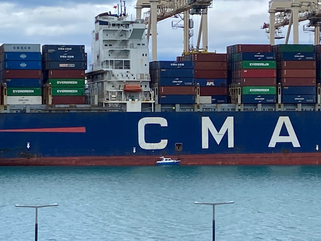 Man beachte die Größenverhältnisse! Unterhalb des „C“ hat ein Boot festgemacht, das vermutlich die Lotsen an Bord gebracht hat /Foto: StH – Oktober 2024)