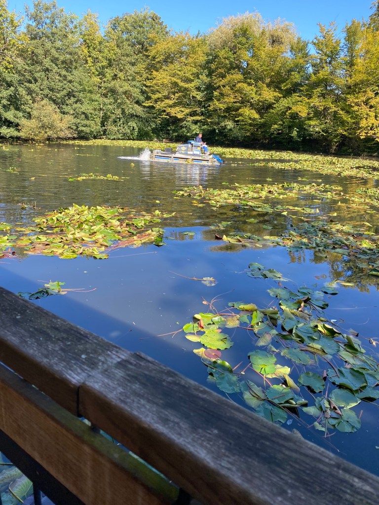 von der Terrasse des Cafés sehen wir den Teich, den ein Boot die Seerosenblätter befreit (Foto: StH)