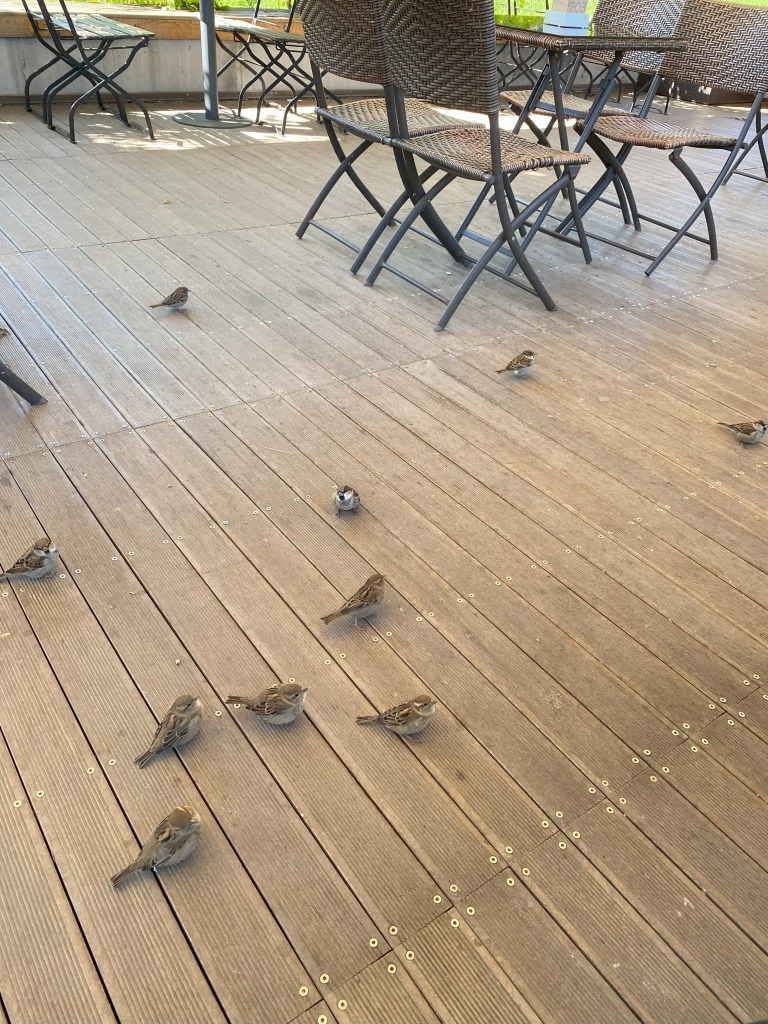 Auch Spatzen freuen sich an den Krumen, die an den diversen Tischen herunterfallen